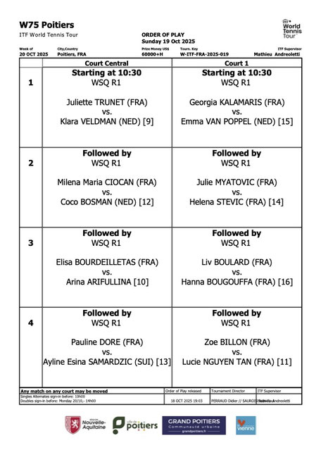 A ne pas rater pour cette première journée, le match de la Française Pauline DORE en toute fin de journée. La joueuse tricolore est parvenue à se qualifier pour le tableau des qualifications, suite à sa victoire dans le tableau des pré-qualifs ! Elle sera opposée à la joueuse Suisse, SAMARDZIC, tête de série 13 de ces qualifications.